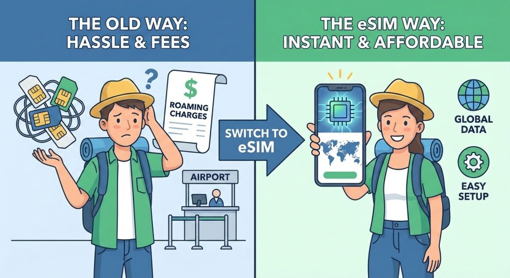 When it comes to staying connected abroad, choosing between an eSIM vs. physical local SIM card is a big decision. Physical SIMs require you to buy a new card every time you switch countries, meaning you have to hunt for a local store, deal with new numbers, and swap out cards. With an eSIM for international travel, you get instant activation without changing SIM cards, making it way more convenient.