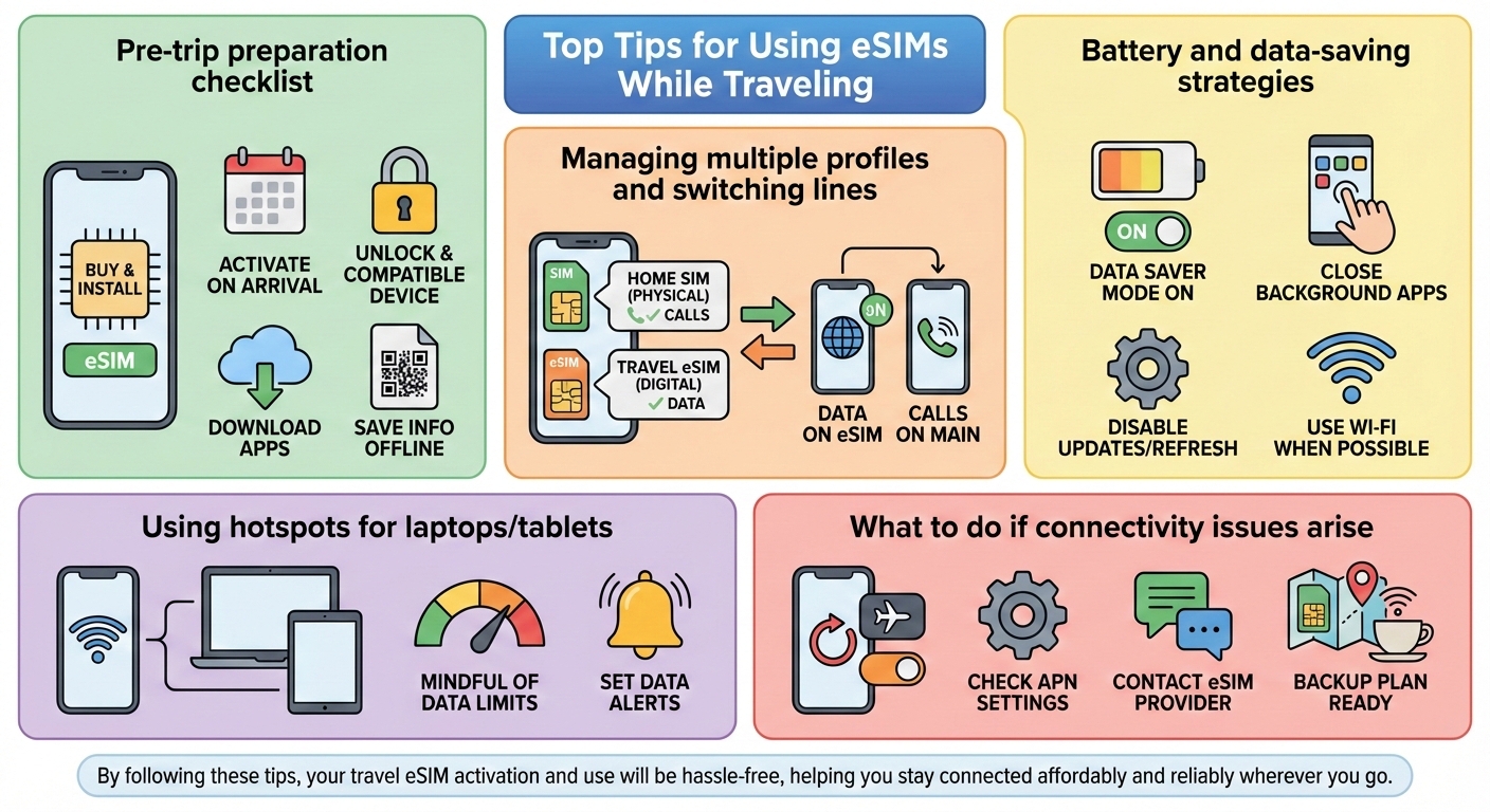 Using an eSIM for international travel is super convenient, but a few smart habits can make your trip even smoother. Here’s a quick checklist: